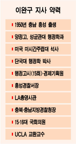 ◇약력 △1950년 충남 홍성 출생 △양정고, 성균관대 행정학과, 미국 미시건주립대 석사, 단국대 행정학 박사 △행정고시(15회)·경제기획원 △홍성경찰서장 △LA총영사관 △충북·충남지방경찰청장 △15·16대 국회의원 △UCLA 교환교수
