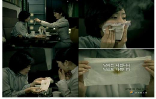 #=카페에 놀러간 친구 중 한 흡연자가 담배를 피우자 비흡연자 친구가 휴지를 주며 '해봐~'라고 한다. 테스트 결과 이물질이 잔뜩 묻어나고 친구들은 깜짝 놀란다. 자막과 함께 "담배는 나쁩니다, 당신도 나쁩니다"라는 나레이션이 흐른다.<친구 카페편>