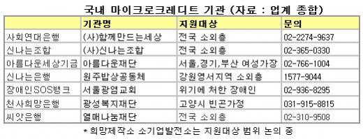 국내에선 사회연대은행 외에도 신나는조합, 아름다운재단, 신나는은행, 씨앗은행 등 10여곳에서 마이크로크레디트를 제공한다. 이들 단체는 마이크로크레디트 운영을 위한 자금 기부를 기다리고 있다.