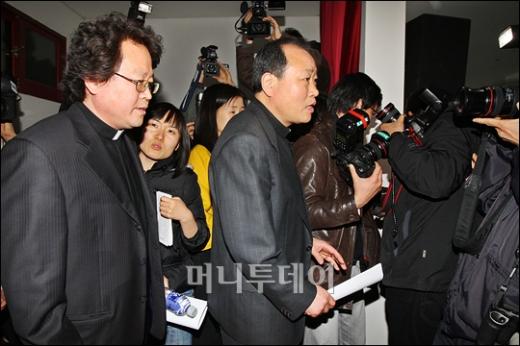 5일 오후 서울 수락산 성당에서 열린 천주교정의구현사제단의 '삼성과 삼성특검의 현국면에 대한 사제단의 입장' 기자회견에 참석한 전종훈 신부를 비롯한 대표신부들이 회견장을 나서고 있다. 사제단은 추가명단 공개에 대해서 "삼성비리 수사의 맨 마지막 단계에서 가능하며 공개가 필요 없도록 본인들이 회개 하는것이 중요하다"고 밝혔다. 독자들의 PICK! 친구 아내와 바람난 남편...월 300만원 받고 방 잡아준 친구 제니, 50억 집도 사더니...용산 '200억' 건물 전액 현금 매입 배우 정은우, 돌연 사망 비보…하루 전엔 SNS에 장국영 사진 구준엽, 서희원 '400억 유산' 두고 장모와 갈등? 처제 입 열었다