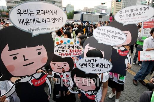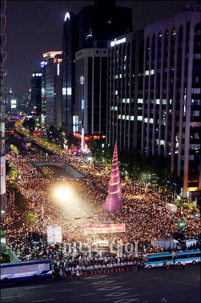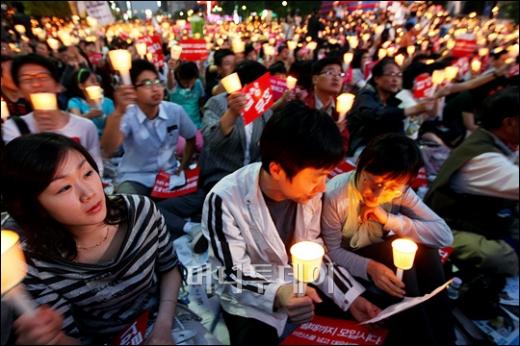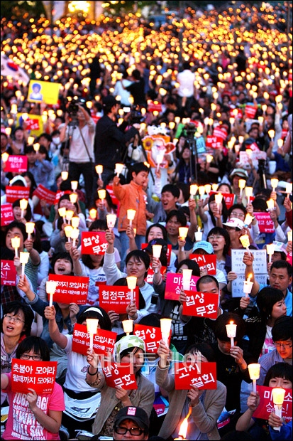 17일 오후 서울 청계광장에서 열린 美 쇠고기 수입 반대 범국민대회에 참여한 시민, 학생들이 촛불을 들고 광우병 쇠고기 수입반대를 외치고 있다. 독자들의 PICK! "친손녀 팔이 그만" 홍서범에 분노한 전 며느리…"'외도 아들' 감싸기" 8살 차이 장모·사위, 금단의 관계로...회복 불가 외도 사례 월 700만원 벌어도..."생활비 30만원, 한국인 남편 짠돌이" "며느리 불륜" 공방에...신혼집에 몰카 설치한 류중일 전 사돈