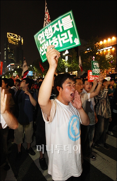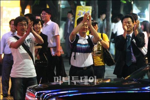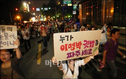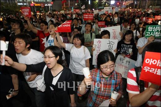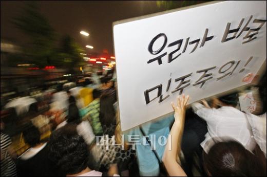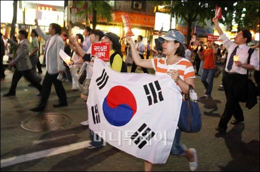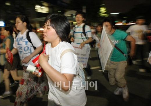↑지나는 시민들이 행진중인 집회참가자들에게 박수를 치고 있다. 정부의 쇠고기 고시 강행에 반대하는 서울시청 앞 촛불집회 참가자들이 29일 오후 서울광장을 출발, 거리행진에 들어갔다. 집회 참가자들은 서울의 도심을 행진하며 '협상무효, 고시철회'를 외치고 있다. 독자들의 PICK! "몇 명이랑 잤나 세어 보자" 장항준 19금 발언 파묘 "사랑해, 뽀뽀 쪽" 은퇴한 남편 녹음파일, 딸 결혼 앞두고 지인 13세 딸 성폭행 살해한 살인범 "동거녀 시체 안고 자" "딸 최진실 통장에 15억, 건물도 환희·준희에"...母, 유산 300억설 반박