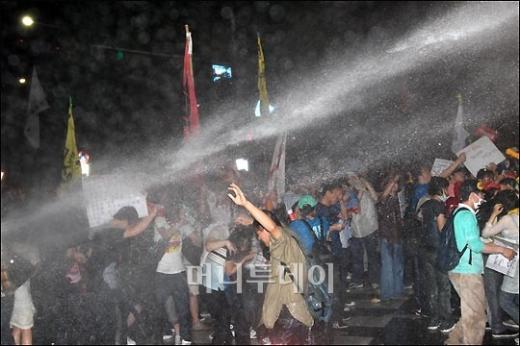 1일 새벽 서울 삼청동 입구에서 정부의 미 쇠고기 고시에 항의하는 시민들이 청와대 입구까지 진입하자 경찰이 물대포를 쏘며 저지 하고 있다.