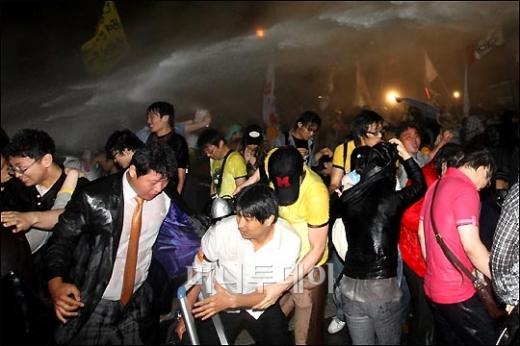 1일 새벽 서울 삼청동 입구에서 정부의 미 쇠고기 고시에 항의하는 시민들이 청와대 입구까지 진입하자 경찰이 물대포를 쏘며 저지 하고 있다. 촛불문화제에 참여한 시민들이 흠뻑 젖어 있다. 독자들의 PICK! "몇 명이랑 잤나 세어 보자" 장항준 19금 발언 파묘 "사랑해, 뽀뽀 쪽" 은퇴한 남편 녹음파일, 딸 결혼 앞두고 지인 13세 딸 성폭행 살해한 살인범 "동거녀 시체 안고 자" "딸 최진실 통장에 15억, 건물도 환희·준희에"...母, 유산 300억설 반박