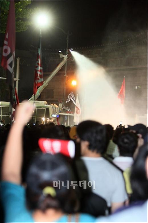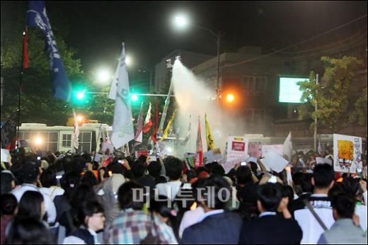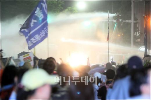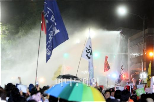 정부의 미 쇠고기 고시에 반대 촛불문화제에서 경찰이 수적인 열세로 애를 먹고 있는 가운데 1일 새벽 서울 삼청동 입구에서 시위대에게 물대포를 쏘며 저지하고 있다. 독자들의 PICK! "몇 명이랑 잤나 세어 보자" 장항준 19금 발언 파묘 "사랑해, 뽀뽀 쪽" 은퇴한 남편 녹음파일, 딸 결혼 앞두고 지인 13세 딸 성폭행 살해한 살인범 "동거녀 시체 안고 자" "딸 최진실 통장에 15억, 건물도 환희·준희에"...母, 유산 300억설 반박