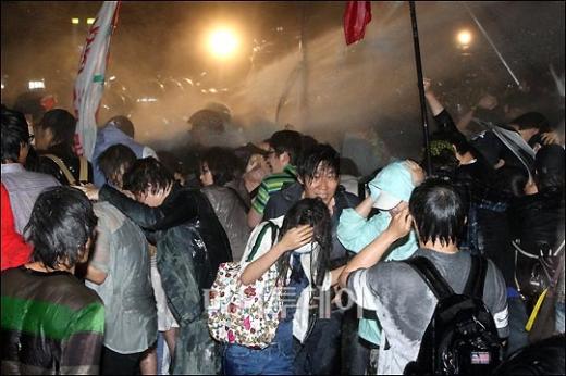 1일 새벽 서울 삼청동 입구에서 정부의 미 쇠고기 고시에 항의하는 시민들이 청와대 입구까지 진입하자 경찰이 물대포를 쏘며 저지 하고 있다. 독자들의 PICK! "몇 명이랑 잤나 세어 보자" 장항준 19금 발언 파묘 "사랑해, 뽀뽀 쪽" 은퇴한 남편 녹음파일, 딸 결혼 앞두고 지인 13세 딸 성폭행 살해한 살인범 "동거녀 시체 안고 자" "딸 최진실 통장에 15억, 건물도 환희·준희에"...母, 유산 300억설 반박