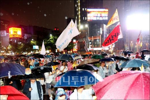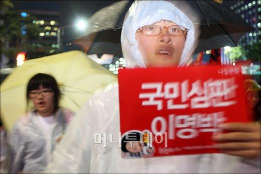 ↑폭우속에서고 계속된 집회 2일 오후 서울 광화문에서 열린 미국 쇠고시 고시 철회 및 연행자 석방을 촉구 하는 촛불집회가 폭우속에서도 계속되고 있다. ↑서울 시청 광장에서 시민들이 촛불집회에 참가 하고 있다. ↑ 국민심판 이명박 피켓을 든 시민이 가두 행진을 하고 있다. ↑ 폭우속에서도 계속된 가두 행진 독자들의 PICK! "자습 때 둘이 사라져"...홍서범 아들 불륜, 학생들 잇단 제보 월 700만원 벌어도..."생활비 30만원, 한국인 남편 짠돌이" 8살 차이 장모·사위, 금단의 관계로...회복 불가 외도 사례 "며느리 불륜" 공방에...신혼집에 몰카 설치한 류중일 전 사돈