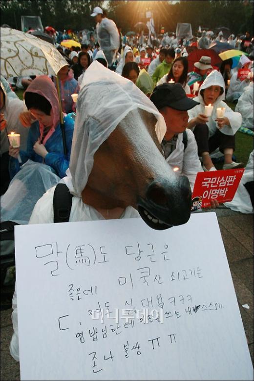 정부가 3일로 예정됐던 미국산 쇠고기 수입위생조건 장관 고시를 유보하고 미국에 30개월 이상 소의 수출중단을 요청키로 한 가운데 이날 저녁 서울 시청광장에서 열린 촛불문화제에서 말 가면을 쓴 집회참가자가 '말도 당근은 좋은데 미국산 쇠고기는 싫다'는 문구를 들고 시위에 참가하고 있다. 독자들의 PICK! "자습 때 둘이 사라져"...홍서범 아들 불륜, 학생들 잇단 제보 월 700만원 벌어도..."생활비 30만원, 한국인 남편 짠돌이" 8살 차이 장모·사위, 금단의 관계로...회복 불가 외도 사례 "며느리 불륜" 공방에...신혼집에 몰카 설치한 류중일 전 사돈