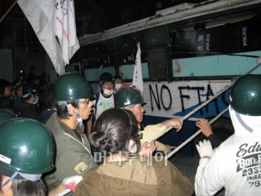 72시간 연속 촛불시위 참가자 일부가 6일 자정을 넘어서면서 안국동과 광화문 새문안 교회 앞 등지에서 경찰과 대치 중이다. 이곳 시위 참가자들은 전경차량을 밧줄로 묶어 끌어내리려는 시도를 하고 있으며 이 과정에서 부상을 입는 참가자와 전경들이 속속 생겨나고 있다. 세종문화회관 뒤쪽 골목길에도 시위인파가 몰려들어 경찰과 몸싸움을 벌이고 있으며 신문로 한글회관 앞에서는 시민들이 전경버스를 밧줄로 묶어 이동시키고 있다. 일부 현장에서는 경찰이 시위대를 향해 소화기를 분사하기도 했다. 독자들의 PICK! "자습 때 둘이 사라져"...홍서범 아들 불륜, 학생들 잇단 제보 월 700만원 벌어도..."생활비 30만원, 한국인 남편 짠돌이" 8살 차이 장모·사위, 금단의 관계로...회복 불가 외도 사례 "며느리 불륜" 공방에...신혼집에 몰카 설치한 류중일 전 사돈