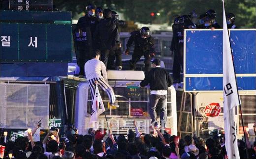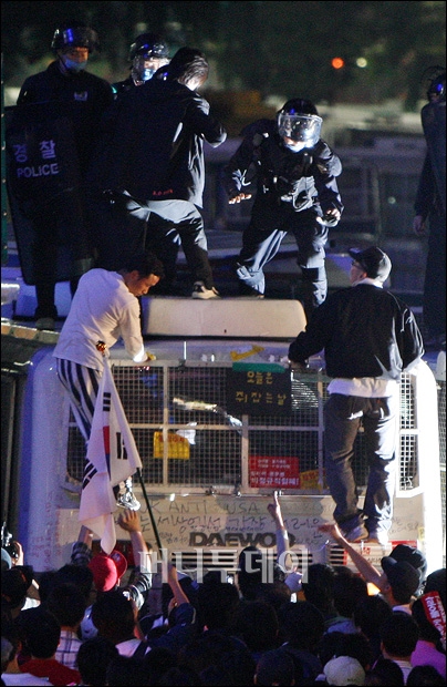 7일 오후 서울 광화문 네거리에서 미국산쇠고기 수입반대 촛불시위에 참석한 시민들이 전경차에 올라 전경과 대치중에 있다. 독자들의 PICK! 홍서범 전 며느리 "아들 외도, 대중에 사과? 저에게 하시라" 분노 월 700만원 벌어도..."생활비 30만원, 한국인 남편 짠돌이" 화사, 속옷이 다 보여...과감한 드레스 연출에 '깜짝' 이하이 "도끼, 하나뿐인 내 남자" 열애 인정…"두 사람 지금 미국에"
