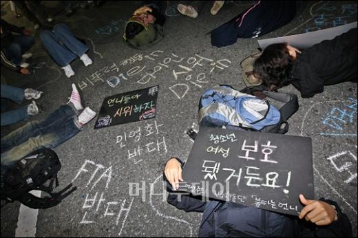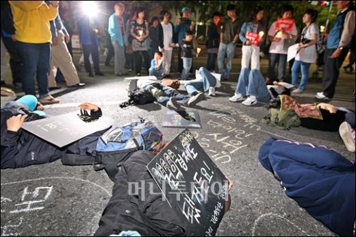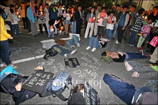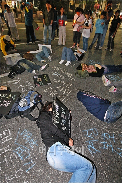 7일 오후 서울 광화문 네거리에서 미국산쇠고기 수입반대 촛불시위에 참석한 여성 참가자들이 거리에 누워 '다이인' 퍼포먼스 시위를 펼치고 있다. 독자들의 PICK! "자습 때 둘이 사라져"...홍서범 아들 불륜, 학생들 잇단 제보 월 700만원 벌어도..."생활비 30만원, 한국인 남편 짠돌이" 8살 차이 장모·사위, 금단의 관계로...회복 불가 외도 사례 "며느리 불륜" 공방에...신혼집에 몰카 설치한 류중일 전 사돈