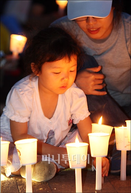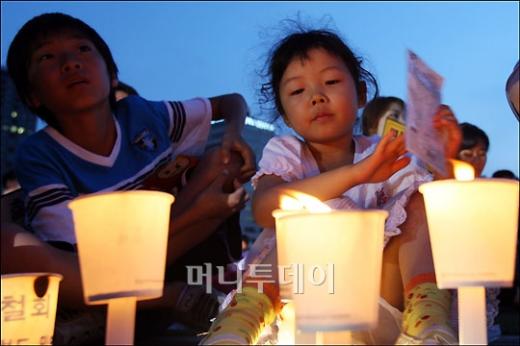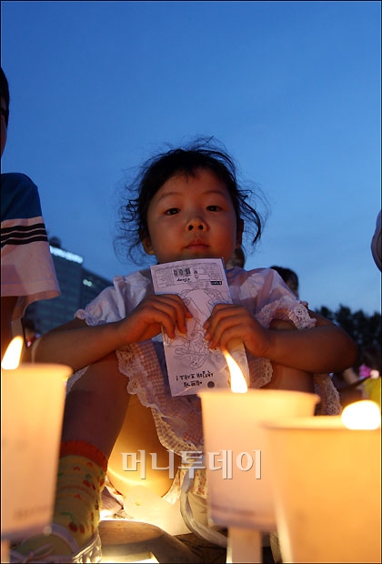 15일 오후 서울시청 광장에서 열린 미국산 쇠고기 수입 반대 촛불시위에 참가한 어린이가 촛불을 밝히고 있다. 독자들의 PICK! "자습 때 둘이 사라져"...홍서범 아들 불륜, 학생들 잇단 제보 월 700만원 벌어도..."생활비 30만원, 한국인 남편 짠돌이" 8살 차이 장모·사위, 금단의 관계로...회복 불가 외도 사례 "며느리 불륜" 공방에...신혼집에 몰카 설치한 류중일 전 사돈