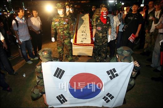 15일 저녁 서울 시청 앞 광장에서 미국산 쇠고기 수입에 반대하는 제39차 촛불 문화제에 참석한 시민들이 예비군 복장을 하고 관을 들고 행진하고 있다. 독자들의 PICK! "자습 때 둘이 사라져"...홍서범 아들 불륜, 학생들 잇단 제보 월 700만원 벌어도..."생활비 30만원, 한국인 남편 짠돌이" 8살 차이 장모·사위, 금단의 관계로...회복 불가 외도 사례 "며느리 불륜" 공방에...신혼집에 몰카 설치한 류중일 전 사돈