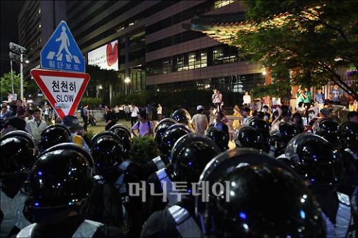 15일 오후 서울 광화문에서 열린 미국산 쇠고기 고시 철회 촉구 촛불시위 거리행진에 참석한 집회참가자들을 해산 시키기 위해 전경들이 횡단보도를 막아서고 있다. 독자들의 PICK! "자습 때 둘이 사라져"...홍서범 아들 불륜, 학생들 잇단 제보 월 700만원 벌어도..."생활비 30만원, 한국인 남편 짠돌이" 8살 차이 장모·사위, 금단의 관계로...회복 불가 외도 사례 "며느리 불륜" 공방에...신혼집에 몰카 설치한 류중일 전 사돈