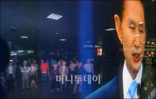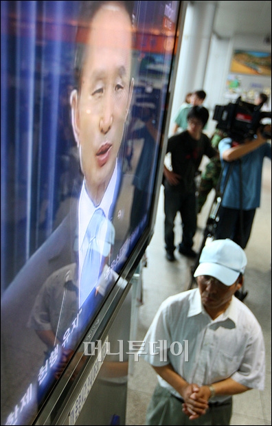19일 오후 서울역 대합실에서 시민들이 이명박 대통령의 미국산 쇠고기 수입문제와 관련한 대국민담화 발표를 TV뉴스를 통해 시청하고 있다.