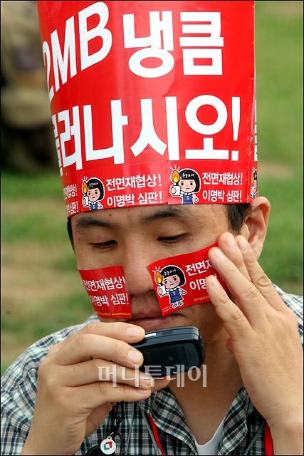 19일 저녁 서울시청 앞 광장에서 열린 미국산 쇠고기 수입반대 촛불집회에 참석한 시민이 이명박 정부를 비판하는 내용이 적힌 스티커를 얼굴에 붙이고 있다. 독자들의 PICK! 홍서범·조갑경, '아들 불륜' 사과…"양육비·위자료 빨리 주도록 할 것" 이휘재 "복귀 중압감에 가위 눌려…실수 잘 알아, 미흡하고 모자랐다" 홍지윤 "식당서 내 앞담화 하더라…충격에 무대공포증" 이하이 "도끼, 하나뿐인 내 남자" 열애 인정…"두 사람 지금 미국에"
