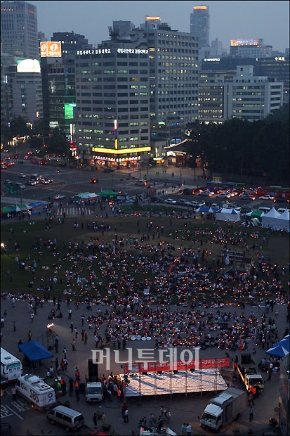 이날 오후 2시 이명박 대통령이 미국산 쇠고기 수입 파동과 관련한 대국민 담화에서 "뼈저리게 반성한다", "대운하도 국민이 반대하면 안한다"고 발표했지만 서울광장에 촛불은 꺼지지 않았습니다.