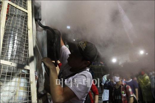 22일 새벽 서울 광화문 네거리에서 열린 미국산쇠고기 수입반대 촛불집회에서 시위 참가자가 전경에게 소화기 분말을 맞고 있다.