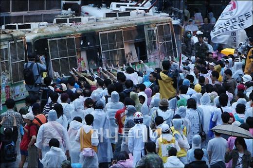 ↑시위대가 전경차의 창문을 깨뜨리자 버스안의 전경이 방패로 막고 있다. 22일 새벽 서울 광화문 네거리에서 열린 미국산쇠고기 수입반대 촛불집회에 참가한 시위대가 전경버스를 끌어내고 있다. ↑ 새벽이 되자 시민들이 전경차를 밀어내고 있다. 독자들의 PICK! "자습 때 둘이 사라져"...홍서범 아들 불륜, 학생들 잇단 제보 월 700만원 벌어도..."생활비 30만원, 한국인 남편 짠돌이" 8살 차이 장모·사위, 금단의 관계로...회복 불가 외도 사례 "며느리 불륜" 공방에...신혼집에 몰카 설치한 류중일 전 사돈