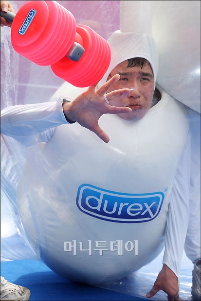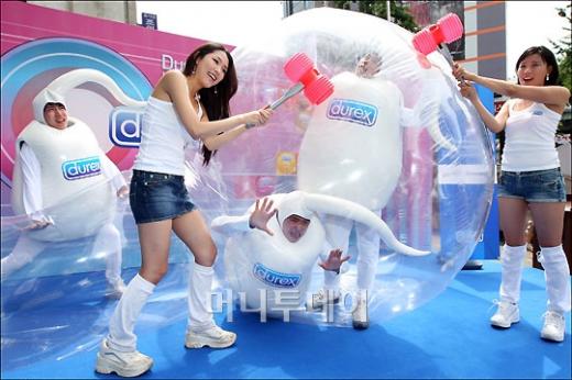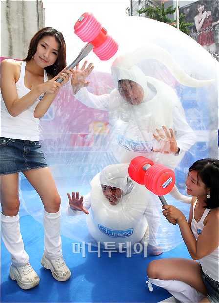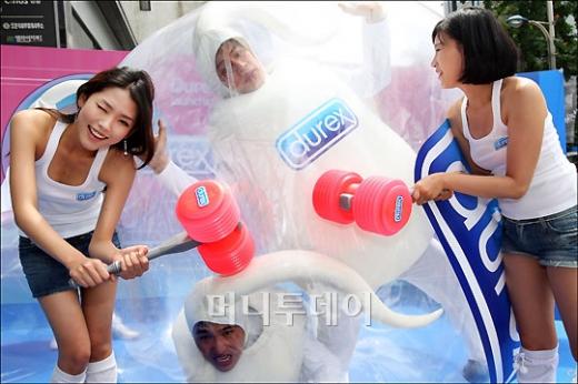 24일 오전 서울 명동 한 야외 행사장에서 콘돔 브랜드 '듀렉스' 국내 출시 이벤트가 열려 모델들이 콘돔 내부에 있는 '스펌맨(정자맨)'이 나오지 못하도록 하는 퍼포먼스를 벌이고 있다. 독자들의 PICK! "친손녀 팔이 그만" 홍서범에 분노한 전 며느리…"'외도 아들' 감싸기" 8살 차이 장모·사위, 금단의 관계로...회복 불가 외도 사례 "며느리 불륜" 공방에...신혼집에 몰카 설치한 류중일 전 사돈 이호선 "아내 병원에 집어넣어"...음주 방임한 남편에 충격 조언