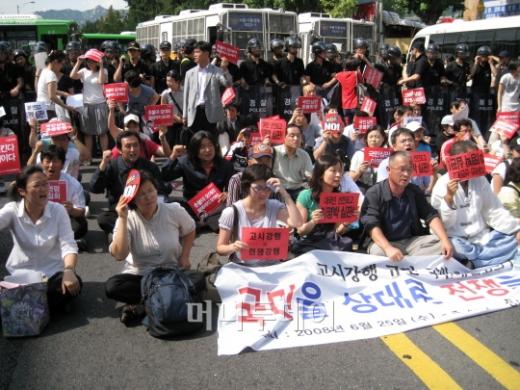 25일 미국산쇠고기 수입위생조건 고시 관보 게재 의뢰가 이뤄지자 이에 항의하는 시민 100여 명이 청와대 인근 경복궁 역 도로에서 연좌시위를 벌이다 무차별 연행됐다.