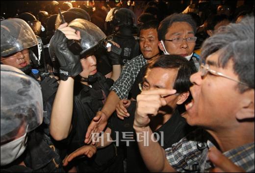 25일 오후 미국 쇠고기 고시 철회 촉구 촛불시위에서 경찰과 시위대가 극한 대치를 하고 있다. 한 시위 참가자가 경찰에게 입에 소화기 분말이 들어갔다고 항의하고 있다. 독자들의 PICK! 홍서범·조갑경 아들, 아내 임신 중 '여교사와 불륜'…"위자료 배상" 8살 차이 장모·사위, 금단의 관계로...회복 불가 외도 사례 "며느리 불륜" 공방에...신혼집에 몰카 설치한 류중일 전 사돈 이호선 "아내 병원에 집어넣어"...음주 방임한 남편에 충격 조언