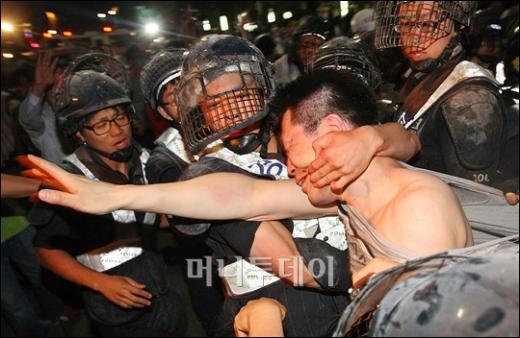 26일 새벽 세종로거리에서 미 쇠고기 수입반대 촛불집회에 참가한 한 시위참가자가 경찰에게 연행되고 있다. 독자들의 PICK! 홍서범 전 며느리 "아들 외도, 대중에 사과? 저에게 하시라" 분노 월 700만원 벌어도..."생활비 30만원, 한국인 남편 짠돌이" 화사, 속옷이 다 보여...과감한 드레스 연출에 '깜짝' 이하이 "도끼, 하나뿐인 내 남자" 열애 인정…"두 사람 지금 미국에"