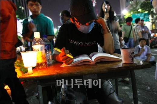 27일 밤 서울 태평로 거리에서 경찰과 대치중인 미국산쇠고기 수입반대 촛불 시위에 민주당 국회의원들이 참석하고 있다.