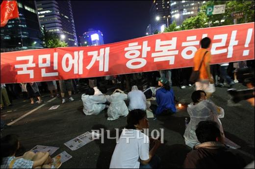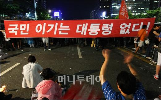 27일 밤 서울 태평로 거리에서 경찰과 대치중인 미국산쇠고기 수입반대 촛불 시위대가 '국민 이기는 대통령 없다!'는 내용의 현수막을 내걸고 있다. 독자들의 PICK! "자습 때 둘이 사라져"...홍서범 아들 불륜, 학생들 잇단 제보 월 700만원 벌어도..."생활비 30만원, 한국인 남편 짠돌이" 8살 차이 장모·사위, 금단의 관계로...회복 불가 외도 사례 "며느리 불륜" 공방에...신혼집에 몰카 설치한 류중일 전 사돈