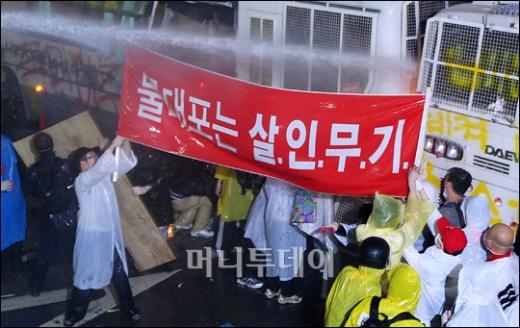 28일 저녁 서울 교보문고 앞거리에서 경찰이 미국산쇠고기 수입반대 촛불시위대에게 살수하자 시위대가 '물대포는 살인무기'가 적힌 현수막을 내걸고 있다. 독자들의 PICK! "자습 때 둘이 사라져"...홍서범 아들 불륜, 학생들 잇단 제보 월 700만원 벌어도..."생활비 30만원, 한국인 남편 짠돌이" 8살 차이 장모·사위, 금단의 관계로...회복 불가 외도 사례 "며느리 불륜" 공방에...신혼집에 몰카 설치한 류중일 전 사돈