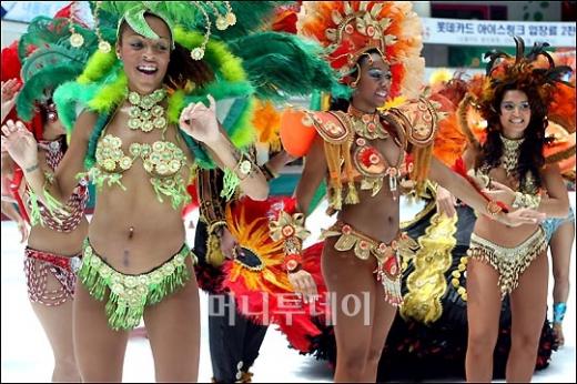30일 오전 서울 잠실 롯데월드 아이스링크에서 삼바 무희들이 열정의 삼바 춤을 선보이고 있다. 고유가 시대에 도심 속에서 즐길 수 있는 삼바축제는 8월 24일까지 계속된다.