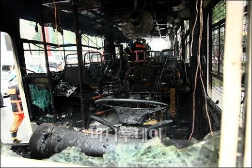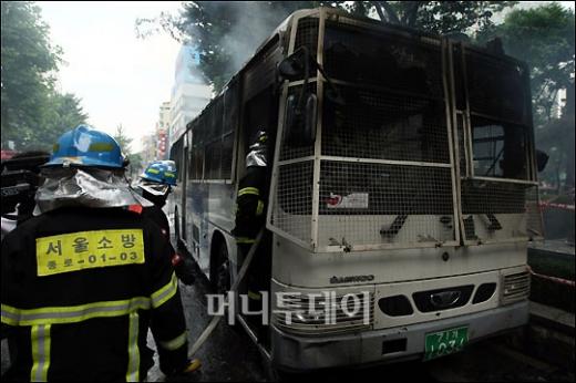 1일 오후 2시35분경 서울 종로구 세종로 동아일보 사옥 옆에 세워진 경찰버스에서 원인 모를 화재가 발생해 119소방대가 출동, 화재를 진압하고 있다. 이 버스는 최근 미국산쇠고기 수입반대 촛불시위 과정 중 경찰 방어막으로 사용되면서 내외부가 심각하게 파손된 상태로 며칠 동안 이곳에 주차돼 있었다. 불길은 오후 3시 현재 진압됐으며 경찰은 화재원인을 조사 중이다. 독자들의 PICK! 5년 전 사라진 걸그룹 리더 충격 폭로…"빚쟁이라며 인터넷방송 시켜" 친구 아내와 바람난 남편...월 300만원 받고 방 잡아준 친구 배우 정은우, 돌연 사망 비보…하루 전엔 SNS에 장국영 사진 구준엽, 서희원 '400억 유산' 두고 장모와 갈등? 처제 입 열었다