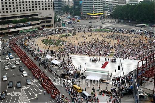4일 저녁 서울 시청광장에서 국민주권수호 권력참회 발원 시국법회에 조계사에서 부터 행진을 시작한 스님들이 시청광장에 도착하고 있다.