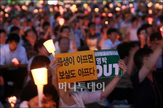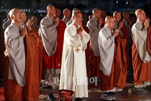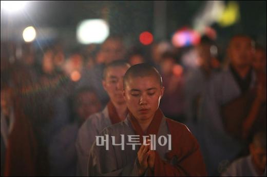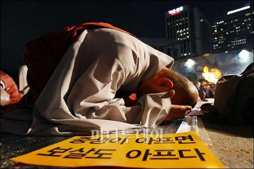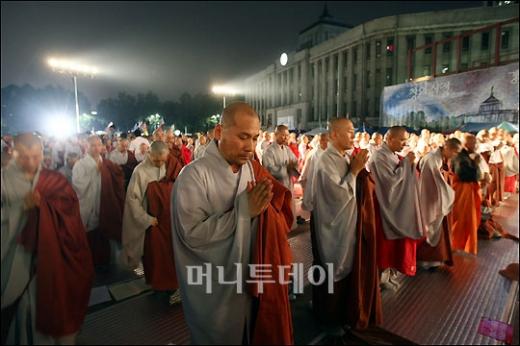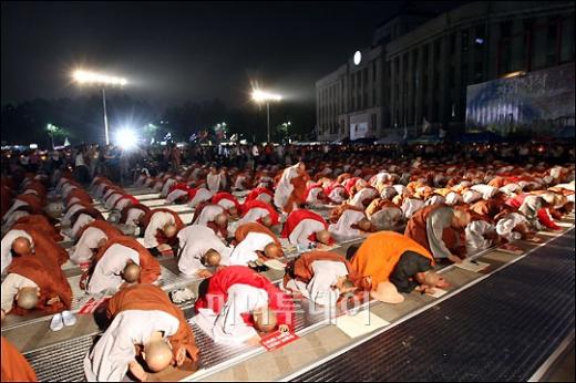 4일 저녁 서울 시청광장에서 국민주권수호 권력참회 발원 시국법회에 참석한 스님들과 시민들이 법회를 진행하고 있다.