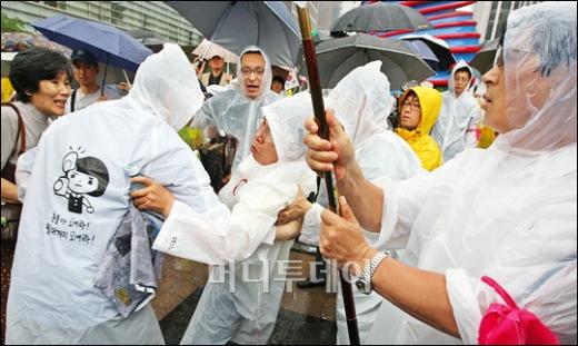 5일 오후 서울 청계광장에서 촛불집회 참가자와 촛불시위 반대집회 참가자가 몸싸움을 하고 있다.