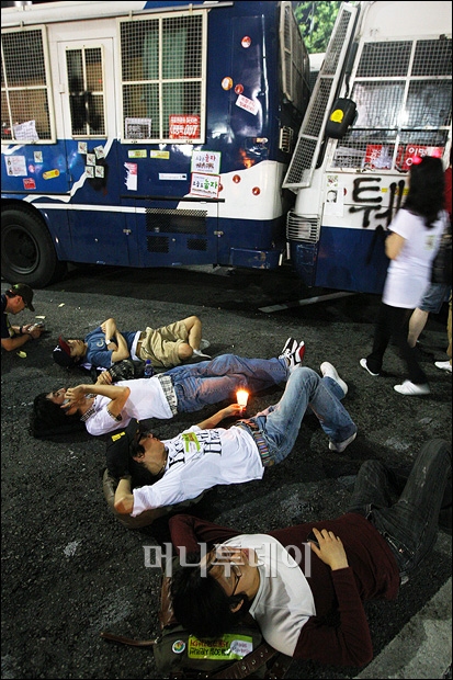 6일 새벽 서울 태평로에서 열린 미국산쇠고기 수입반대 촛불시위에 참석한 시위참가자들이 경찰버스 앞에 누워 농성을 벌이고 있다. 독자들의 PICK! 홍서범·조갑경 아들, 아내 임신 중 '여교사와 불륜'…"위자료 배상" 8살 차이 장모·사위, 금단의 관계로...회복 불가 외도 사례 "며느리 불륜" 공방에...신혼집에 몰카 설치한 류중일 전 사돈 이호선 "아내 병원에 집어넣어"...음주 방임한 남편에 충격 조언