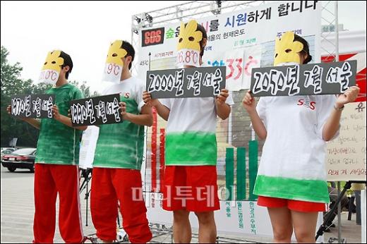 22일 오후 서울광장 앞에서 'SOS 도시 숲 열섬 저감효과 체험 행사'(주최 서울그린트러스트, 생명의 숲 국민운동)의 일환으로 도심 열섬현상으로 인한 온도변화로 짧아진 의복을 보여주는 퍼포먼스를 하고 있다. 독자들의 PICK! 5년 전 사라진 걸그룹 리더 충격 폭로…"빚쟁이라며 인터넷방송 시켜" '40억 건물주' 이해인 "대출만 32억…이자 계산하다 못 자" 토로 친구 아내와 바람난 남편...월 300만원 받고 방 잡아준 친구 배우 정은우, 돌연 사망 비보…하루 전엔 SNS에 장국영 사진
