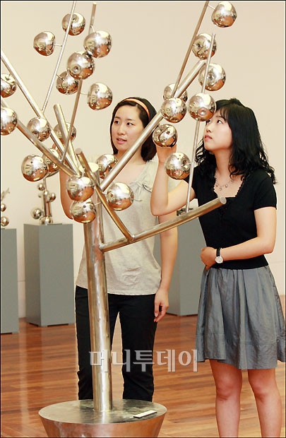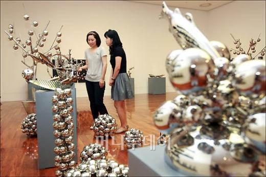 5일 오전 서울 소공동 롯데 백화점에서 '진영섭 작가의 금속 공예전'이 열려 관람객들이 작품을 감상하고 있다.