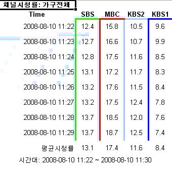 한편 박태환 선수가 지난 9일 출전했던 400m 자유형 예선 경기 시청률은 KBS 2TV 26.9%, MBC 15.8%, SBS 13.1%를 기록했다. 방송 3사 시청률 합은 55.8%를 기록하는 높은 인기를 보였다.