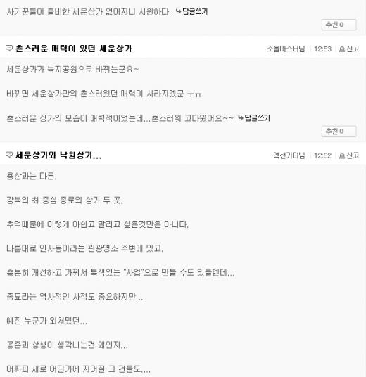 ☞"추억의 세운상가가 없어지는구나. 어릴 적에는 세운상가 갈 때마다 가슴이 콩닥콩닥 뛰었는데..." (vasox, 네이버)
