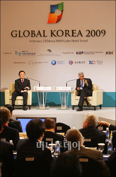 23일 오전 서울 소공동 롯데호텔에서 새 정부 출범 1주년을 기념해 개최된 '글로벌 코리아 2009' 국제학술회의에 참석한 로버트 루빈 미국 전 재무장관(오른쪽)이 기조강연을 마친 후 기자들의 질문에 답하고 있다.