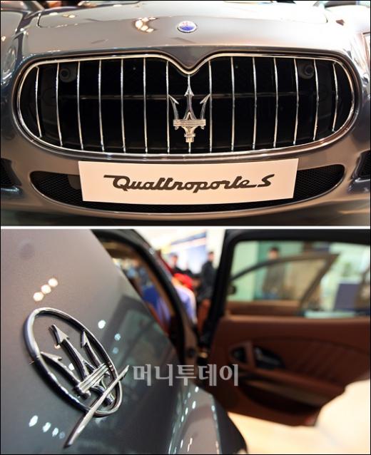 25일 오전 서울 강남 신사동 마세라티 전시장에서 스포츠 세단 마세라티 신차 '콰트로포르테 S(Quattroporte S)' 출시전이 열렸다. 사진은 라디에이터그릴과 마세라티 로고 모습.