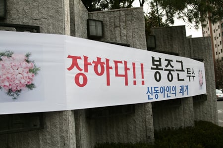 서울 용산구 동부 이촌동 신동아 아파트 입주자들이 24일 월드베이스볼클래식(WBC) 결승전 선발투수로 출장한 '동네 이웃' 봉중근을 응원하는 플래카드를 단지 입구에 내걸었다. 독자들의 PICK! 16살 아들 절친과 성관계한 시장…친동생도 미성년 성범죄자 "딸 최진실 통장에 15억, 건물도 환희·준희에"...母, 유산 300억설 반박 김주하 "전 남편에 맞은 아들, 장롱 속에서 1시간" 장윤정 "어머니 은행계좌 돈 다 털렸다" 충격...무슨 일?