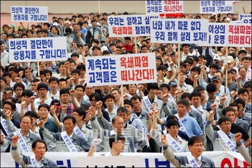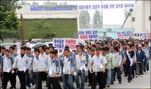 쌍용자동차 전임직원들이 10일 오전 경기 평택 공설운동장에서 라인정상화를 촉구하는 결의대회를 열고 있다. 쌍용자동차 사무, 연구, 기술직 직원 4,500여명은 노동조합의 불법 공장 점거 파업으로 20만명이 넘는 협력사 가족의 생계를 위태롭게 하고 있다며 파업을 즉각중단하고 라인 정상화를 촉구하는 전임직원 결의대회를 개최했다. ↑결의대회를 마친 쌍용차 임직원들이 가두행진을 하고 있다. 독자들의 PICK! 홍서범·조갑경, '아들 불륜' 사과…"양육비·위자료 빨리 주도록 할 것" 이휘재 "복귀 중압감에 가위 눌려…실수 잘 알아, 미흡하고 모자랐다" 홍지윤 "식당서 내 앞담화 하더라…충격에 무대공포증" 이하이 "도끼, 하나뿐인 내 남자" 열애 인정…"두 사람 지금 미국에"