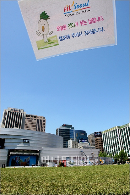 6.10 민주항쟁 정신계승 범국민대회로 몸살을 앓았던 서울광장이 11일 오후 재개방을 위한 잔디보수와 청소를 위해 휴식에 들어가고 있다. 독자들의 PICK! "대기업 더 비싸" 이경실, 달걀 논란 해명…"'군인' 아들, 국방부 조사" '와인 바꿔치기' 논란 후…안성재, 고급 샴페인 행사서 포착 음란물까지 뿌렸다...고교 농구코치, 제자와 부적절한 관계 허니문 베이비 '출생의 비밀'...결혼 직전 전남친 만난 아내