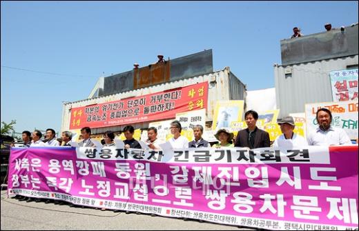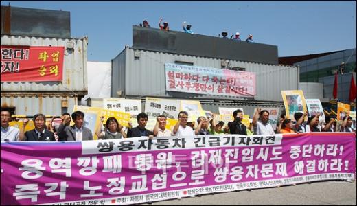 쌍용차 노조의 옥쇄파업이 장기화 되며 사측간의 갈등이 극에 달한 가운데 24일 오전 경기 쌍용자동차 평택공장 앞에서 자동차 범국민대책위원회가 사측의 용역투입 사과를 요구하는 기자회견을 열고 있다.