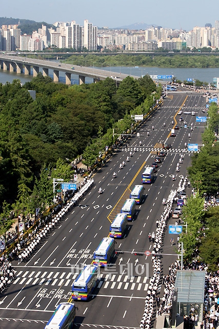 故 김대중 전 대통령의 국장 영결식을 마친 운구행렬이 23일 오후 서울 여의도 국회를 나서 동교동 자택을 향하고 있다. 독자들의 PICK! "성소수자 지인과 불륜"…최동석, 박지윤 상간소송 각하에 항소 '환갑' 지석진, 은퇴 후 정계 진출하나…역술가 "정치색은…" 여제자 14번 간음, 숨지자 "내가 당해"…65세 파면 교수 죗값은 故정은우 "형동생 했던 것들에 뒤통수"...지인에 남긴 문자
