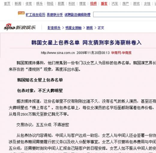 지난 20일 중국 언론 신냥유러(신당오락)는 “한국의 한 매체가 연예인들을 대상으로 한 스폰서 명단을 입수했다”며 “한국 연예계에 오랫동안 존재해 온 ‘숨은 규칙’이 다시 수면으로 떠올랐다”고 보도했다.