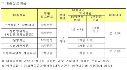 대출 대상자는 신용등급 7등급 이하의 저신용·저소득층으로 프랜차이즈 창업자금, 창업임차보증금, 운영자금 등을 지원한다. 또 소상공인진흥원과 연계해 창업 및 사업운영과 관련된 컨설팅 서비스도 제공한다.