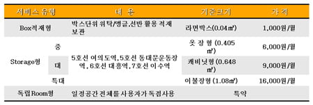 보관료도 매우 저렴하다. 한 달 보관료 기준으로 △박스적재형은 라면박스 크기(0.04㎥)가 1000원 △스토리지형은 옷장형(0.405㎥) 6000원, 캐비닛형(0.648㎥) 9000원, 이불장형(1.08㎥) 1만6000원 △독립룸형은 1㎥당 3만원이다. 독립룸형을 사용할 경우 물건크기에 따라 보관료가 결정된다. 이 가격은 50% 할인 가격으로 1년 간 시행 후 보관료를 인상할 계획이다. 결제는 현금, 자동이체, 신용카드 모두 가능하다.